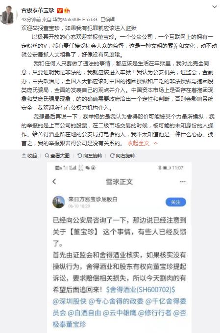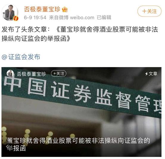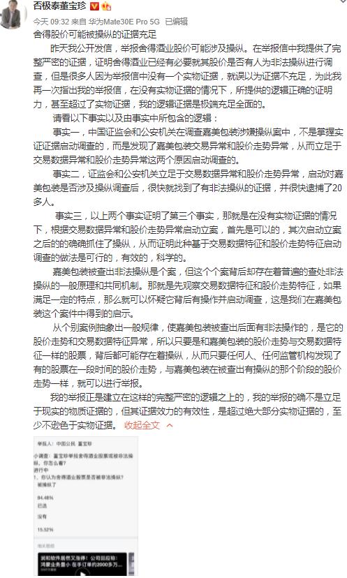 6月10日上午09:32,董宝珍在微博上对其举报舍得酒业作出回应:舍得股价可能被操纵的证据充足。
