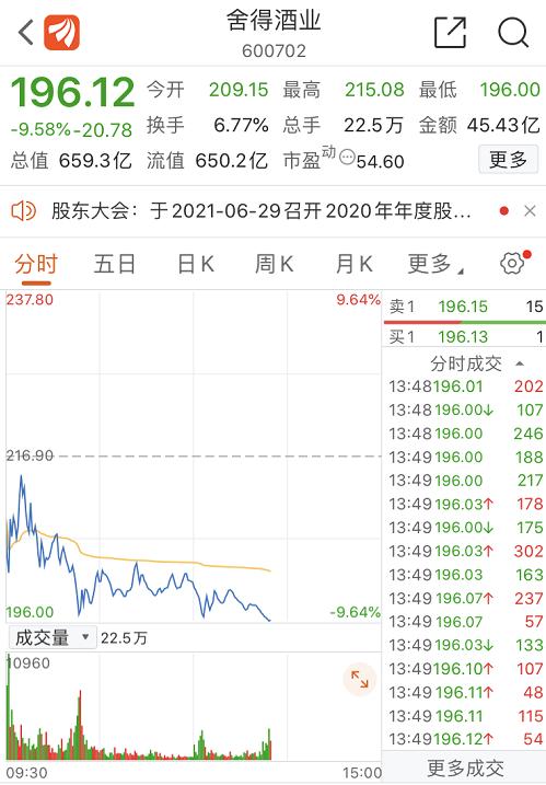舍得酒业今早低开后震荡走低,截止午盘,其股价下跌7.37%,报200.92元/股。午后继续下行,几近跌停,失守200元关口。
