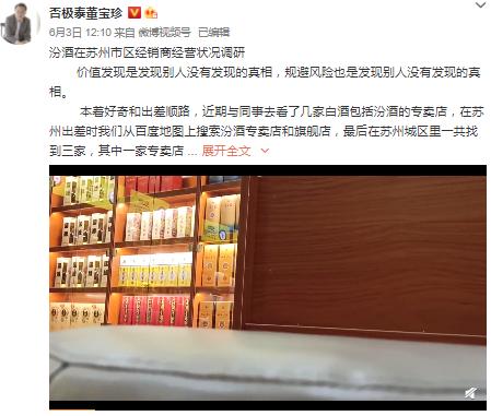 就在上述微博发布不久之前,董宝珍还发布了他对“汾酒在苏州市区经销商经营状况”的调研结果,并配有调研视频。