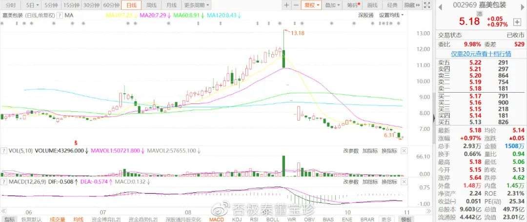 董宝珍称, 因监管机构发现嘉美包装走势不正常,2020年9月9日,短短几分钟股价就上演“天地板”,之后一路暴跌,而在此前股价几乎快速翻倍。5月21日证监会发布信息称,与公安机关联合行动查获嘉美包装操纵犯罪,并将犯罪分子抓捕。