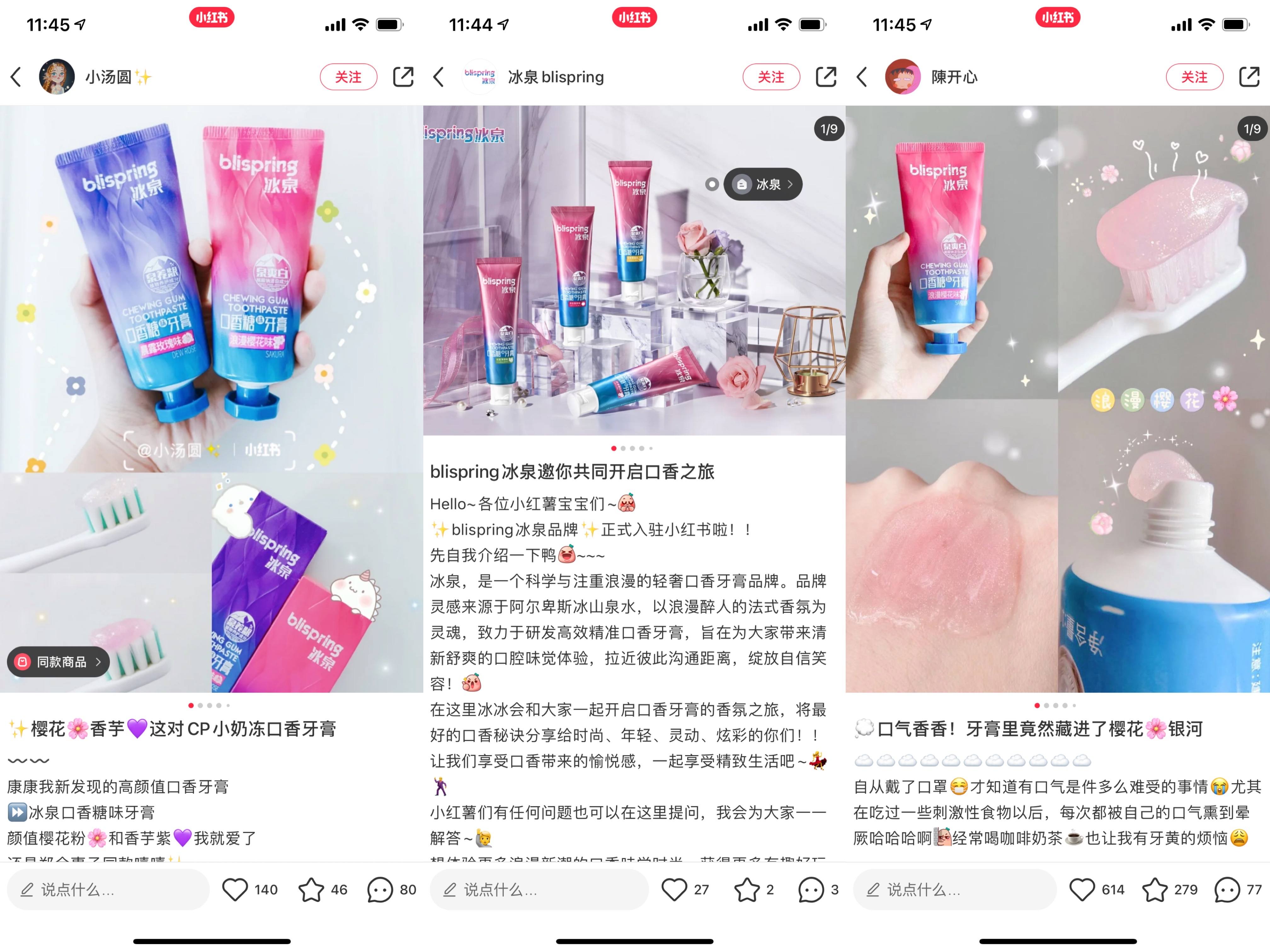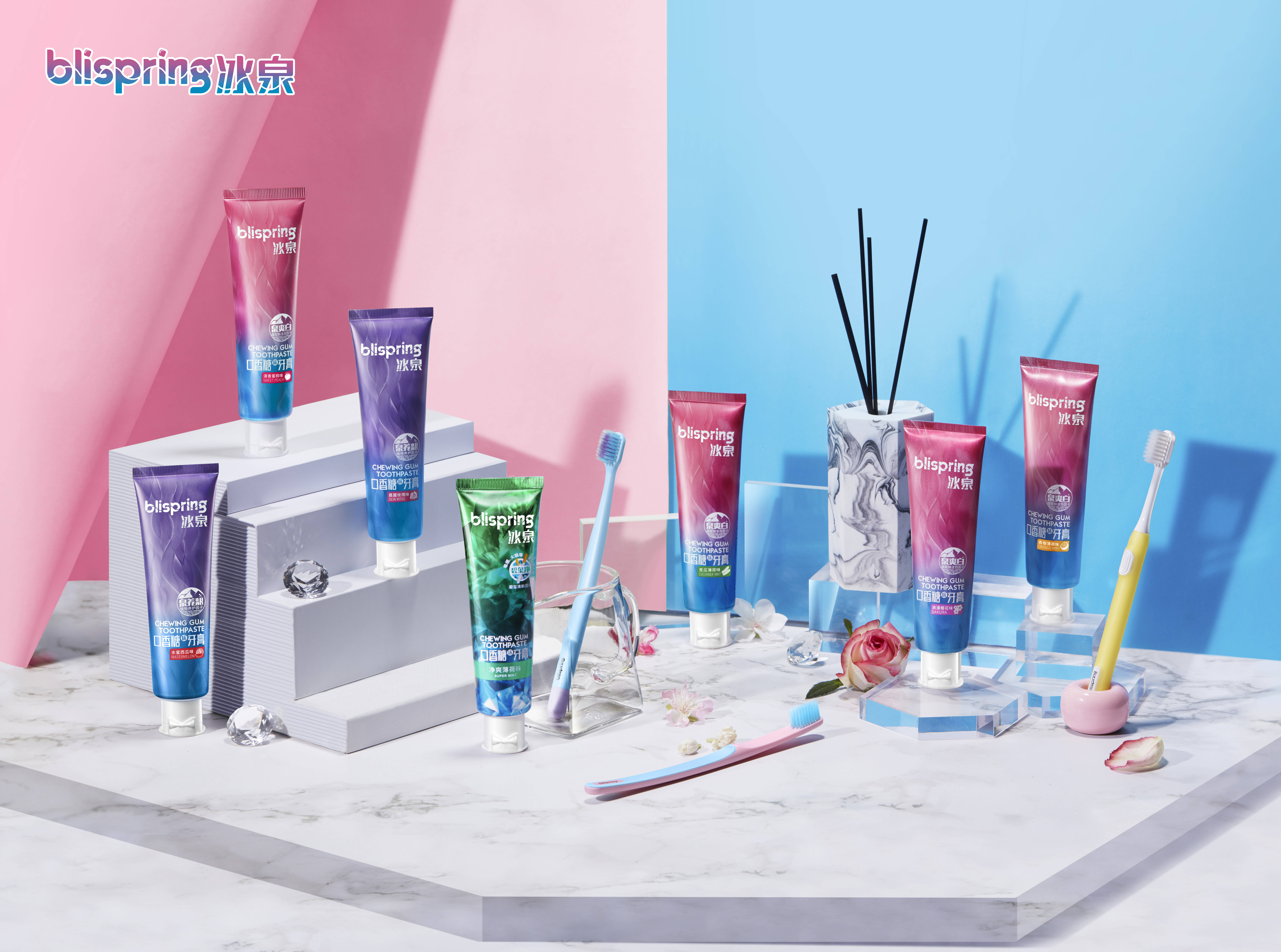 同样是2019年,新锐口腔品牌冰泉blispring(下简称“冰泉”)创立,通过推出社交型口香牙膏打破传统功效型产品的原有框架,研发口香糖牙膏、冰淇淋牙膏等系列单品,迎合年轻人追求口味颜值与社交分享的偏好,迅速在抖音、快手、小红书等平台出圈。