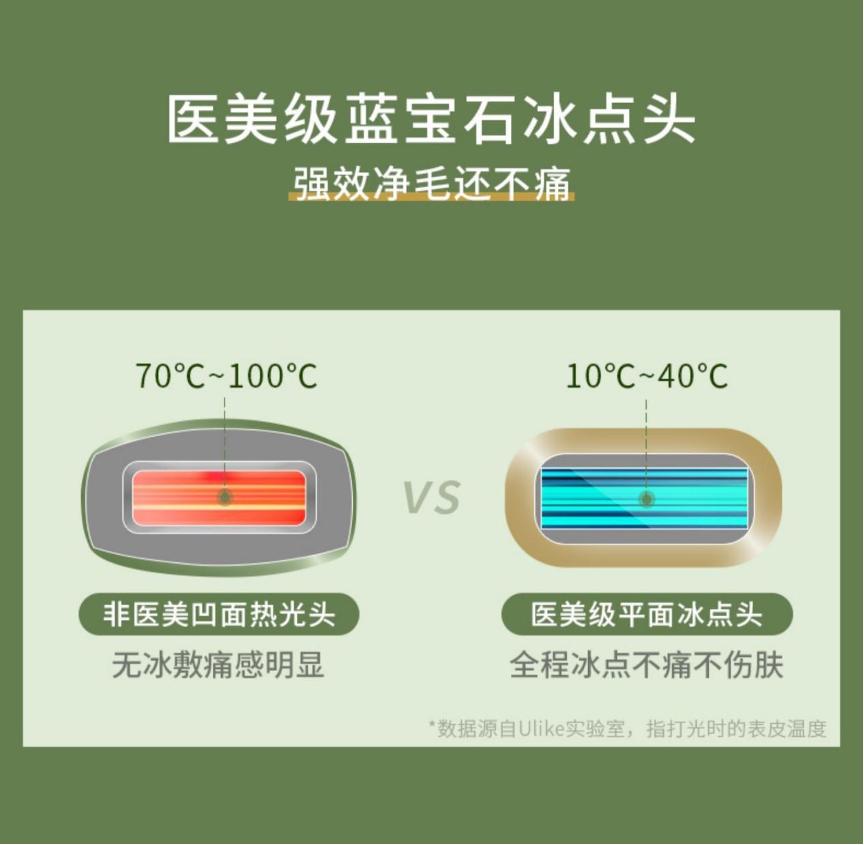 基于此,作为最早专注光学脱毛领域的家用脱毛仪品牌,Ulike为了降低脱毛痛感,便开始对传统的凹面热光脱毛设备进行重新改良,率先将院线级蓝宝石冰点脱毛科技家用化,设计出了蓝宝石冰点脱毛仪。利用蓝宝石的高透光性和热传导性,实现毛根升温至70度时皮肤表面能够及时冷却降温至10度,以达到冰点脱毛的效果,避免皮肤的灼伤。同时,蓝宝石平面灯头的设计,也能够比凹面设计提升30%-40%的脱毛效果。