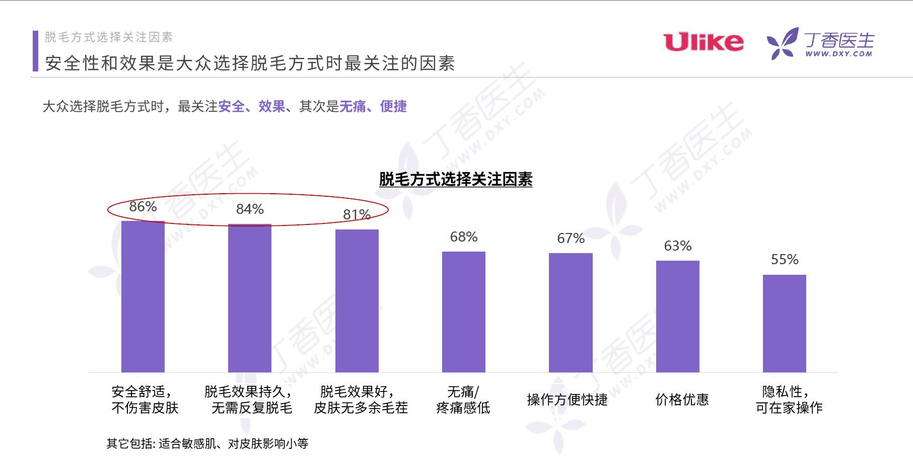 在丁香医生与Ulike联合发布的《2020年大众脱毛行为与习惯调研报告》中,通过用户调研也发现,大众用户选择脱毛时,最关注的便是安全与效果,其次是无痛及便捷。