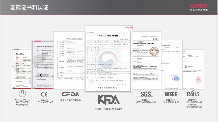 Ulike通过自建研发中心来推动产品不断升级迭代,不断从功效和用户体验的角度打磨产品。无论是蓝宝石冰点脱毛,还是光疗嫩肤脱毛,Ulike均已获得了国家实用新型专利。目前,Ulike已经获得了韩国KFDA认证、日本PSE产品安全认证、欧洲CE、欧盟WEEE、中国ROHS、SGS光不伤肤认证等多个专业机构认证证明。产品上更是获得了ELLE美妆大奖、天猫金妆奖、芭莎国际美妆大奖、OnlyLady风尚大奖等诸多奖项。