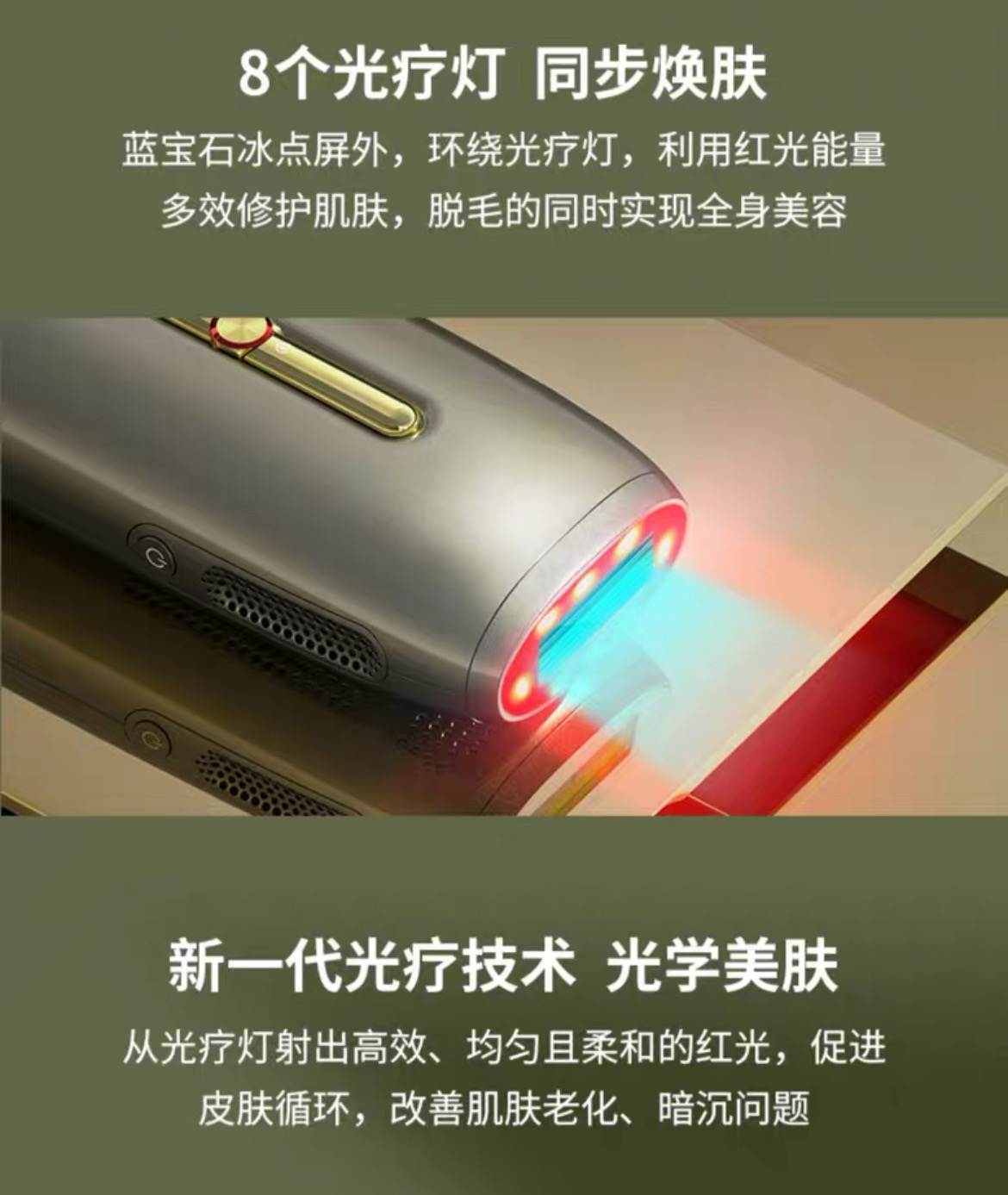 也正是由于蓝宝石平面出光口设计的改良,让Ulike能够在脱毛仪拥有更多功能上的拓展性,比如,在蓝宝石冰点屏外,环绕8颗光疗嫩肤灯,利用红光能量,在用户脱毛的同时实现嫩肤功能,而这在传统脱毛仪的产品设计中难以做到的差异化体验。