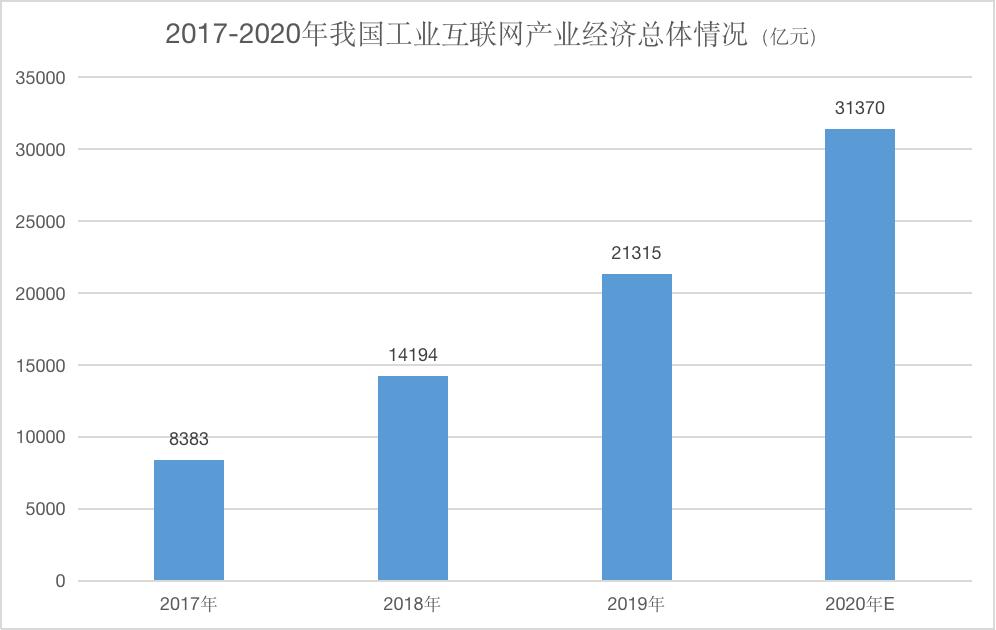 在市场总体规模方面,根据中国信息通信研究院,2018年我国工业互联网产业经济总体规模为1.42万亿元,同比实际增长 55.7%。其中,工业互联网核心产业增加值规模为 4386 亿元、工业互联网融合带动的经济影响规模为9808亿元,分别同比增长 30.1%和 95.7%。预计 2020 年,工业互联网产业经济总体规模约为 3.1万亿元,同比实际增长约为 47.9%,工业互联网核心产业约为 6520 亿元,工业互联网融合带动的经济影响约为 2.49 万亿元。