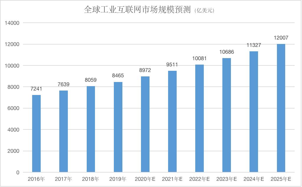 根据 CCID 的数据显示,2019 年全球工业互联网市场规模约为8465.6 亿美元;预计 2020 年全球工业互联网市场规模约为 8948 亿美元,到 2022 年预将首次突破 1 万亿美元,未来 2020-2025 年保持 6%的年化复合增长。
