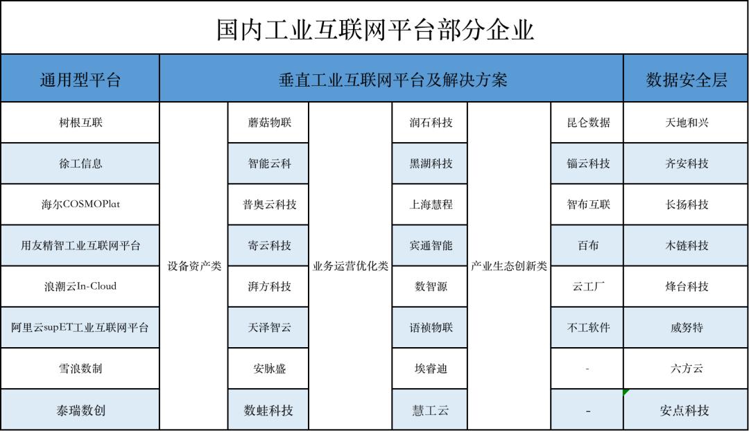 目前,国内的工业互联网全产业链涉及多个领域的企业,包括将原有的解决方案向工业领域延伸的传统 IT 企业、提供工业解决方案的运营商和通信设备提供商、提供工业互联网基础平台支撑的互联网巨头、为客户提供整体解决方案的传统工业设备厂商、研发低功耗互联网芯片的芯片企业等。