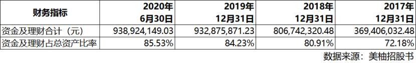 通过分析美柚股份披露的财务报表数据和附注后,我们计算出了自2017年以来历年的各类货币资金和银行理财资金的总金额以及其占资产的比重。截至2020年6月30日,美柚拥有的资金及理财合计近9.4亿元,占资产比超过八成。