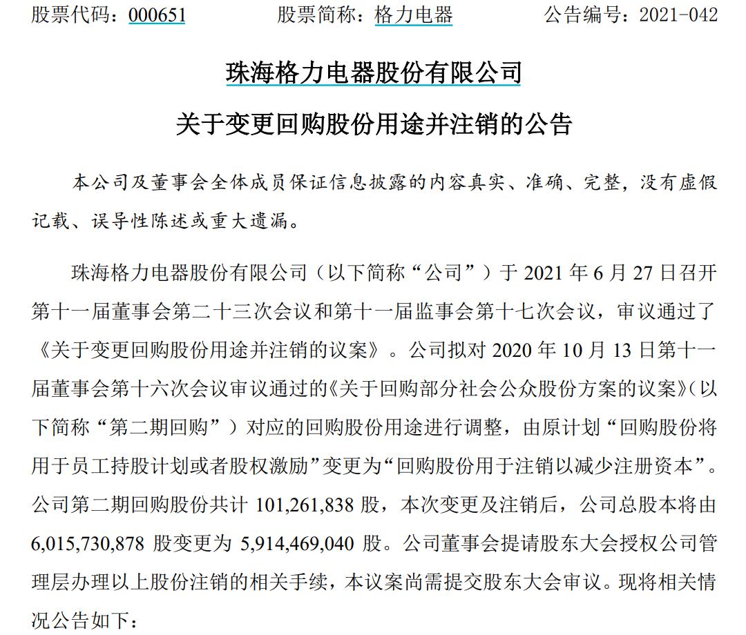 6月27日晚间,格力电器(000651,SZ)发布公告称,拟对2020年10月13日第十一届董事会第十六次会议审议通过的《关于回购部分社会公众股份方案的议案》(简称“第二期回购”),对第二期回购股份用途进行了调整,由原计划“回购股份将用于员工持股计划或者股权激励”变更为“回购股份用于注销以减少注册资本”。