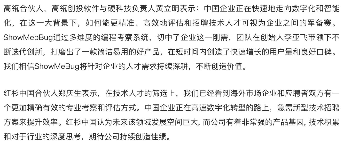 36氪首发 | 技术人才评估与在线面试服务商「ShowMeBug」获两大顶级基金联合领投A轮融资,将快速拓展产品及市场
