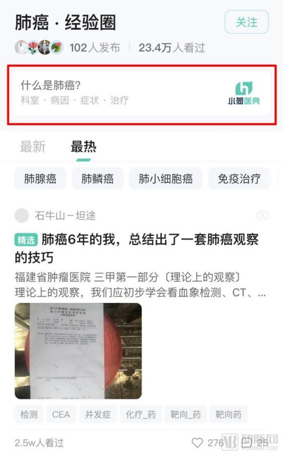 有意思的是,点开某一类疾病的圈子后,在页面的顶部会出现该类疾病的科普内容,且标注为“小荷医典”提供。这里需要提及的是,“小荷医典”是由去年字节跳动豪掷5亿元全资收购的“百科名医”升级而来。官方披露的数据显示,“小荷医典”已有健康科普词条超3.2万多条。