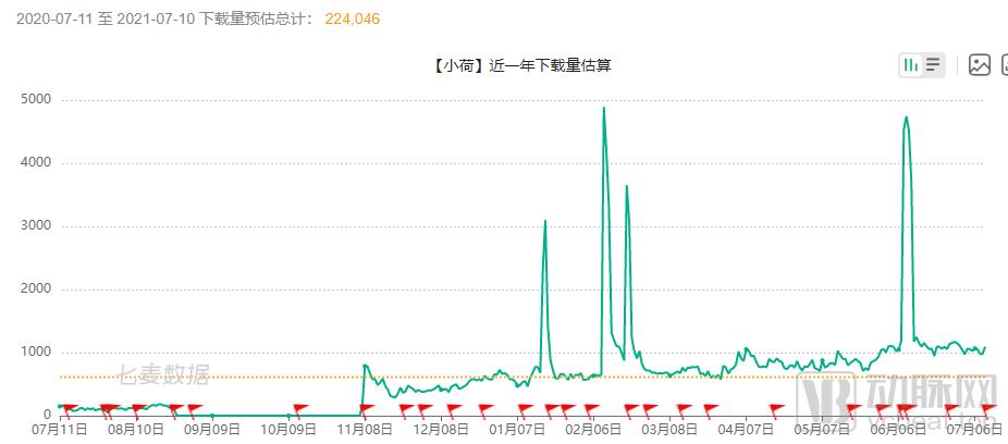 具体到运营上,“小荷”APP目前已经积累了一定数据。比如在下载量方面,根据七麦数据的监测,“小荷”APP今年1季度在iPhone平台上的下载量处在历史高位,最高单日下载量达到4892次,而近一个月日均下载量为1536次,从上线到目前已累计有21万次下载量。