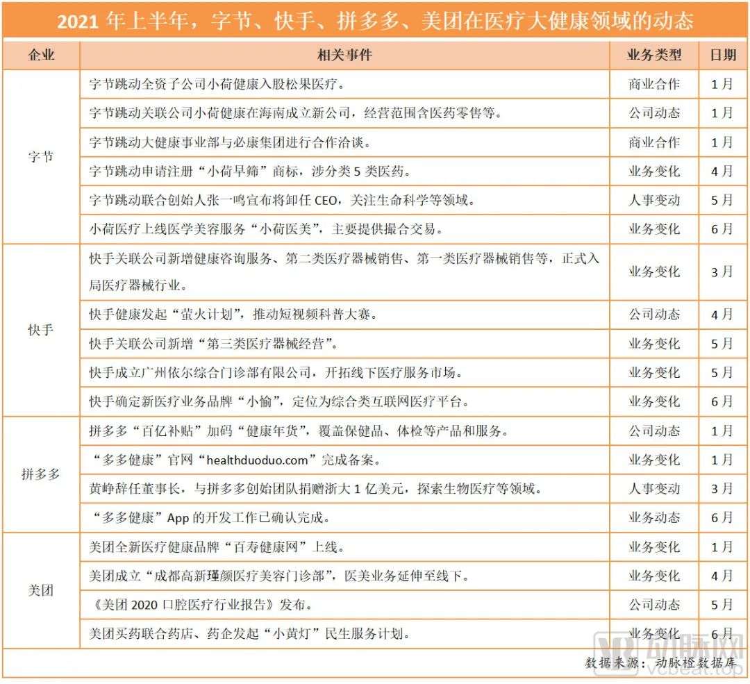 这半年来,以字节跳动、快手、拼多多、美团为代表的各大互联网巨头动作频频,纷纷加码互联网医疗。目前披露的大事就有: