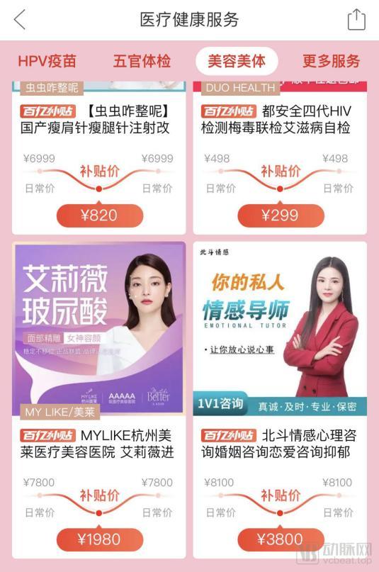 值得注意的是,在页面版块之间,拼多多也推出了“医疗健康服务”板块。动脉网点进去之后发现,目前该板块已经涵盖“HPV疫苗”、“五官体检”、“美容美体”、“更多服务”(以体检为主)四个部分。为了吸引到更多用户使用该类服务,拼多多在拼价策略上,实施了百亿补贴计划。以9价HPV疫苗预约为例,该服务价格为4000元,平台补贴为891元,加上优惠券,实际拼单价为2909元。