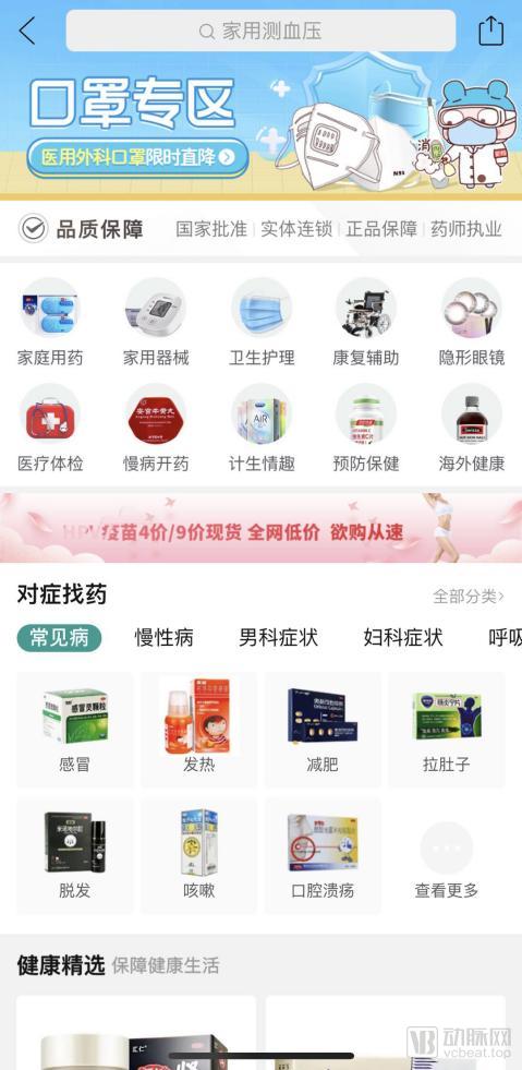 于是在业务的前期探索中,拼多多在App的一级入口中打造了“医药馆”板块。该板块分成了三大类:一是“品质保障”(以医疗器械、体检等为主),二是“对症找药”(以医药销售为主),三是“健康精选”(平台推荐相关医疗用品)。