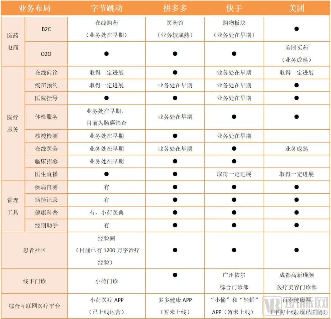 纵观字节、快手、拼多多、美团,它们都从自己的核心领域出发,开始向医疗大健康延伸,且各自都已有了一定的布局。从构建综合类的互联网医疗平台的角度出发,字节跳动无疑走在了前列,美团和拼多多也有了优势细分业务,快手整体要缓慢一些。