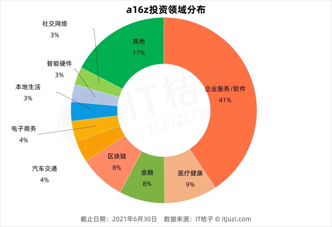 有数据统计,在 a16z 投资的所有标的公司中,软件公司所占比例为 66%。IT 桔子数据库则显示,a16z 对企业服务/软件领域的投资数量有 159 起,在整体投资中占到了 41%,也是重中之重;其次,a16z 对医疗、金融、区块链相关的投资也比较多。这源于 2019 年初,a16z 曾提出的其计划布局的五大技术趋势,其中包括生物医疗、数字货币、区块链、人工智能以及金融科技等行业。