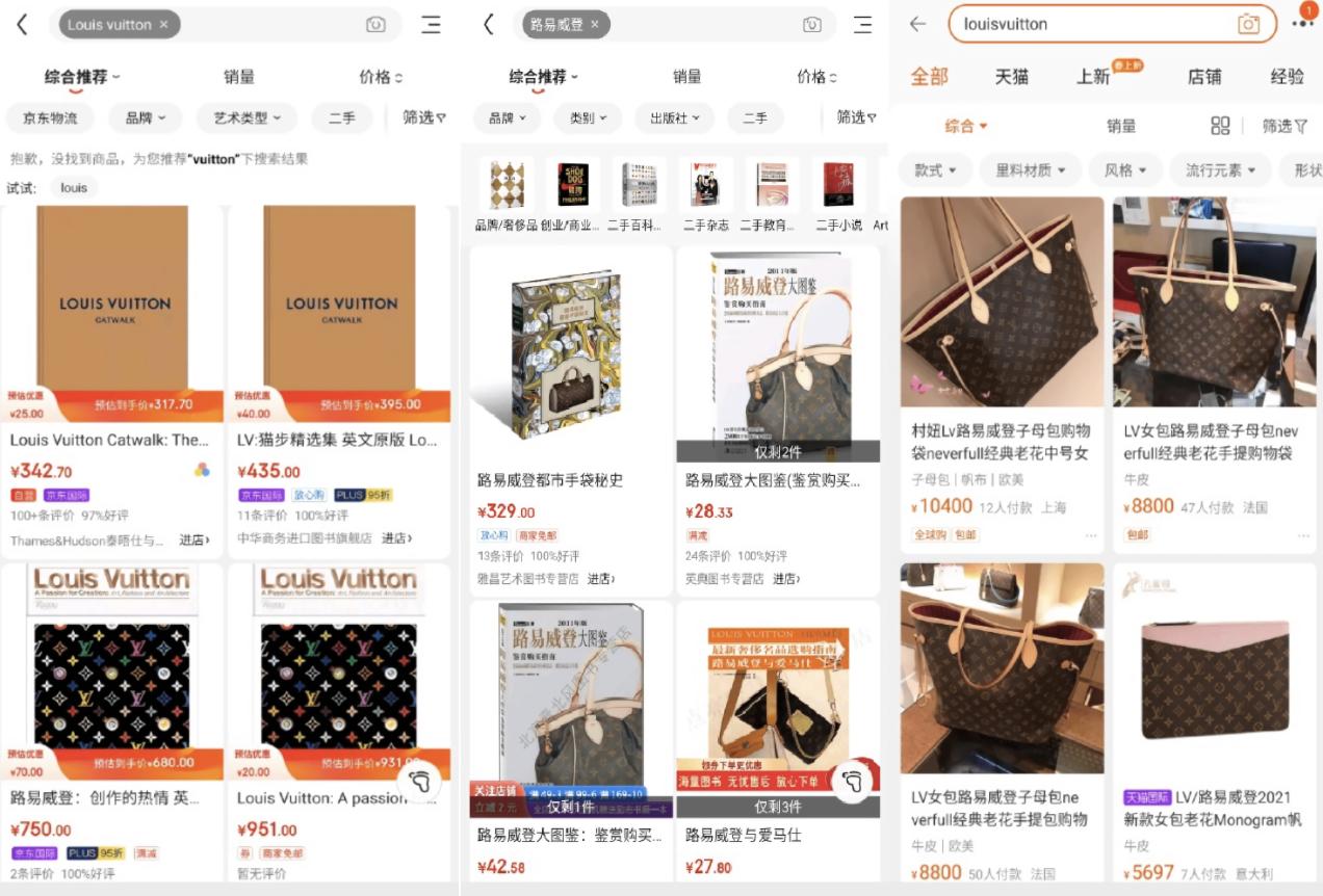 在奢侈品牌纷纷加码线上业务的趋势下,LV对于第三方电商平台的选择一直格外谨慎。与京东合作之前,路易威登仅在微信小程序和母公司LVMH集团旗下奢侈品电商平台24S开设了线上购买渠道。在京东和淘宝上面搜索LV,往往无法得到相关联的搜索结果,或者弹出的都是第三方商家产品。