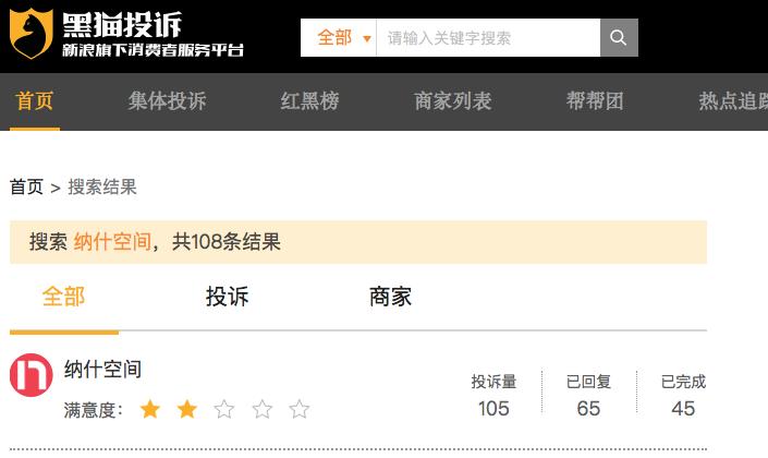 此外,租户的押金无法及时退回,占据了投诉平台上关于纳什空间投诉的主要部分。在新浪旗下黑猫投诉平台上,从2019年12月以来,已经累计有相关投诉105条,未回复结案的65条,其中,有退租的租户表示,退租后7个月没有拿到应该在20日之内退回的押金。