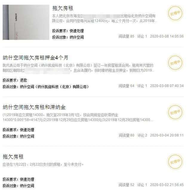 在一些投诉平台上,从2019年以来,陆陆续续有北京、上海、天津等地的业主投诉纳什空间房租支付延期、不按照合同缴纳违约金、滞纳金。亦有多位房东表示,遭遇纳什空间单方面要求降租或将房租季付改月付的情况,还有房东表示,即便降租,纳什方面也出现了拖欠房租的情况。
