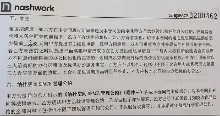 而纳什北京区域相应负责人告知张先生,合同里并没有约定需要提前一个月通知。张先生这才发现,租约合同里,约定了租赁到期后租户的责任和义务,租户租约到期后,需要至少30天提出续约申请,才能继续续约,而对甲方(纳什空间)却没有有任何约束。