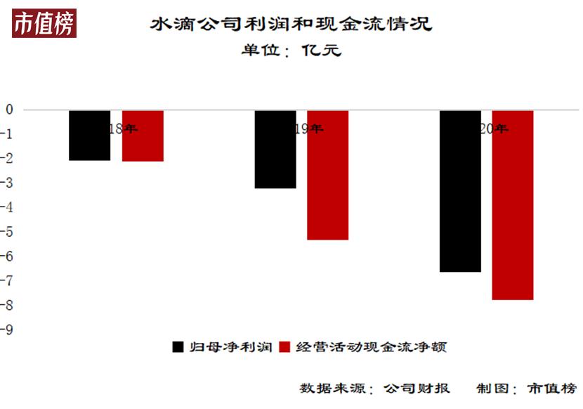从净利润上看,2018年至2020年,水滴公司分别亏损了2.09亿元、3.22亿元和6.64亿元。从经营活动现金流来看,净流出从2.11亿元扩大到7.77亿元。