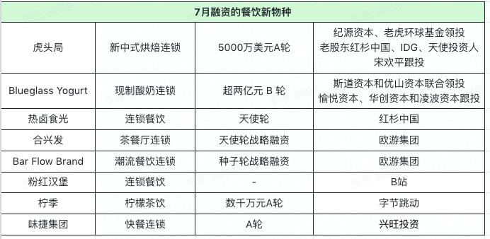 7月的另外一个亮点是,依靠产品微创新崛起,潮流餐饮集合店开始得到资本青睐。比如欧游集团相继投资了两个种子轮项目Bar Flow Brand和合兴发,前者强调潮牌属性的空间设计和爆款产品,通过打造潮流感、网红感、艺术感吸引网红、明星和KOC主动打卡。后者将茶餐厅与冰室结合,推出了「茶冰室」的模式。