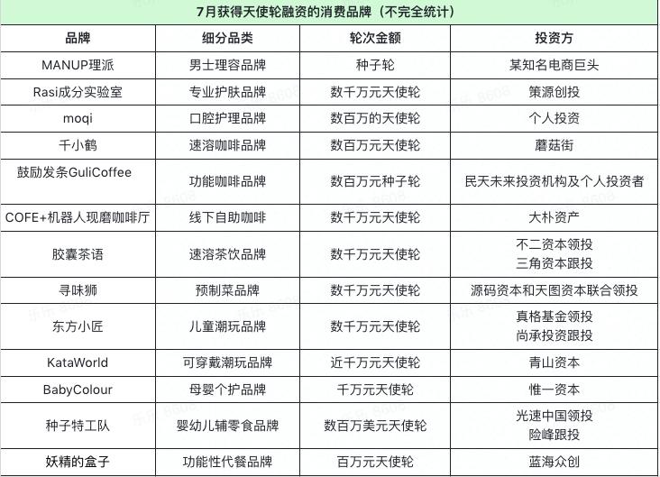 不出意外,7月消费投资仍旧大火,超过70个项目拿到了融资,其中接近一半为品牌,涵盖了护肤、零食、预制品、潮玩、服装等多个品类,且天使轮种子轮居多。这也说明这个拥挤的赛道继续迎接着更多的创业者。