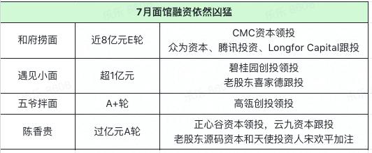 本月餐饮行业,面馆依旧热闹,相继有和府捞面、遇见小面、五爷拌面、陈香贵拿到过亿融资。线下咖啡连锁有三家拿到融资,包括代数学家、seesaw和M Stand。