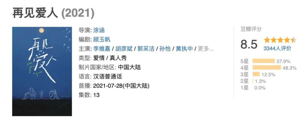 万没想到,《再见爱人》让同样抱有质疑的犀牛君“真香”了。这档芒果TV自制、国内首档离婚综艺开播后拿下豆瓣8.5的高分,评论区被“太好哭了”、“章贺喊话让我猛男落泪”、“现实加长版《婚姻故事》”等各类好评填满。