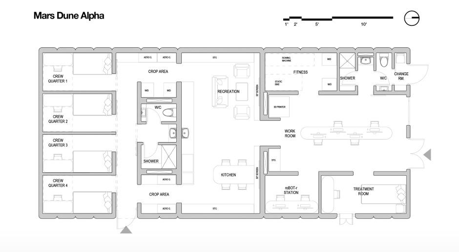 该项目被命名为“阿尔法火星山丘(Mars Dune Alpha)”,隶属于NASA的“乘员健康和性能探索模拟(CHAPEA)”计划之下。实验基地建在位于美国休斯顿的约翰逊太空中心内,由美国知名建筑公司BIG设计、建筑 3D 打印公司 ICON建造,总面积为1700平方英尺(约158平方米)。