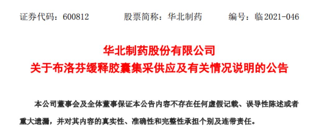 8月22日晚间华北制药紧急发布公告回应表示,公司布洛芬缓释胶囊中选后,虽然公司积极采取了相关措施,但由于现有产能不足,责任单位重视程度不够,相关注册和变更政策调整,加之疫情影响,导致公司无法保障正常供应。公司为了尽量降低对山东省集采供应的影响,2021年8月,经与山东省医疗保障局沟通,由公司提出放弃中选资格,山东省邀请其他企业对该产品补标。