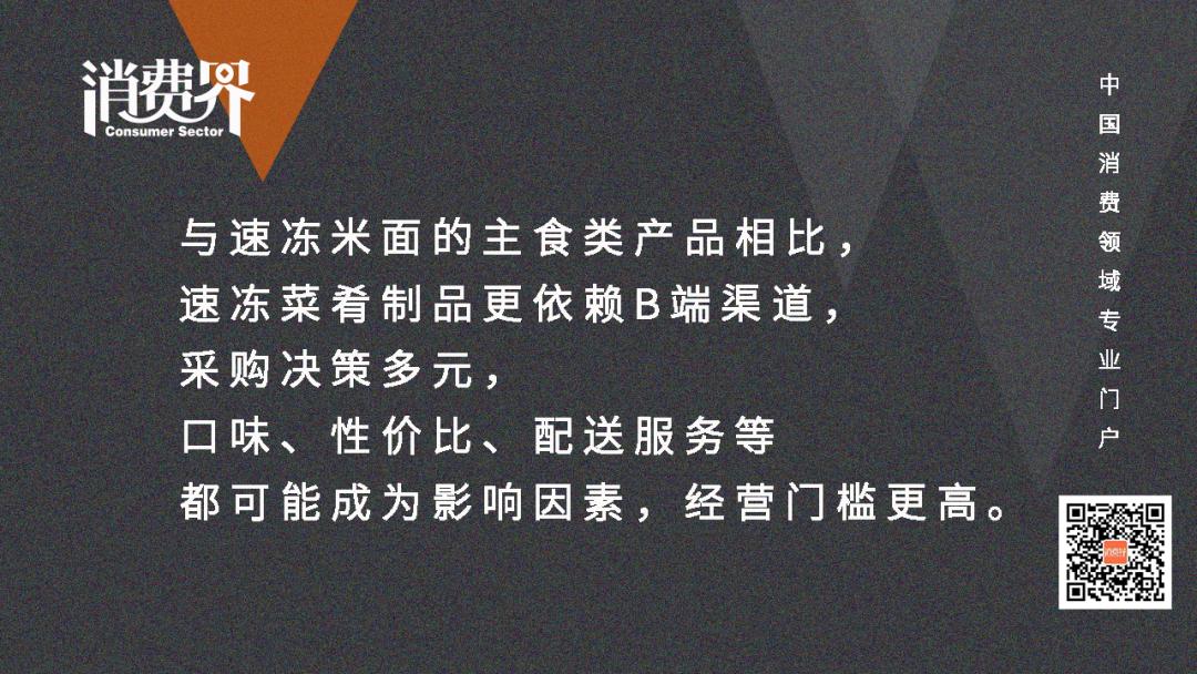 与速冻米面的主食类产品相比,速冻菜肴制品更依赖B端渠道,采购决策多元,口味、性价比、配送服务等都可能成为影响因素,经营门槛更高。