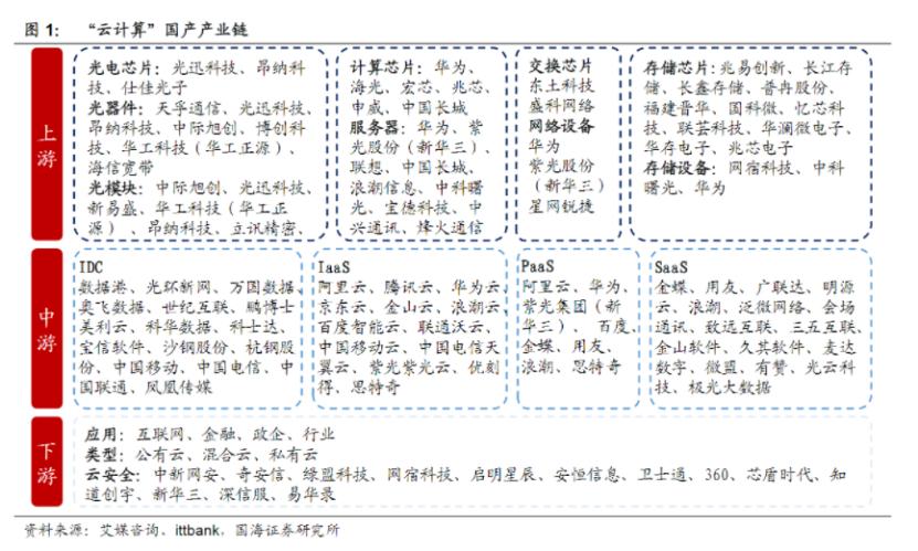 而既然是势在必行的庞大市场,那么就具体来看一下,云计算的产业链上中下游主要构成和标的:
