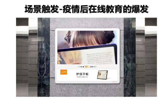案例2:去年疫情后在线教育爆发,学生上网课的护眼问题引发家长关注。小天才通过分众电梯面向社区居民投放广告宣传“护眼平板”。 这则广告同时结合了家庭学习场景和疫情后时间点两大场景要素。