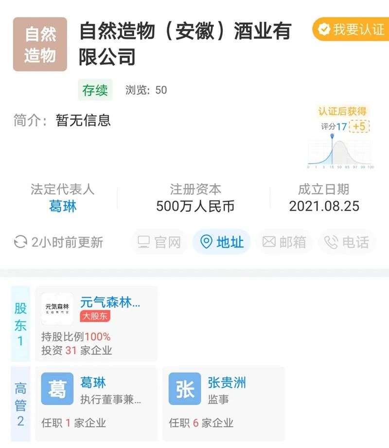 8月27日,自然造物(安徽)酒业有限公司成立,该公司由元气森林全资控股。公司经营范围为酒类经营、食品销售、互联网销售。此前元气森林曾投资过观云白酒、碧山啤酒等品牌.