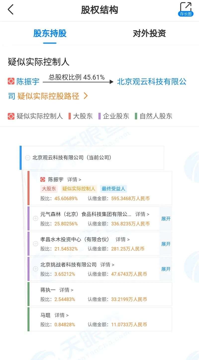 目前观云白酒的创始人陈振宇持有45.61%的股份、元气森林持股25.8%、孝昌水木投资持股21.5%、挑战者资本持股3.65%。其中,除元气森林和挑战者资本为唐斌森持有股份外,孝昌水木投资的六成股份也属于挑战者资本。通过三家公司的持股比例,唐斌森和观云白酒创始人的股份占比相差无几。