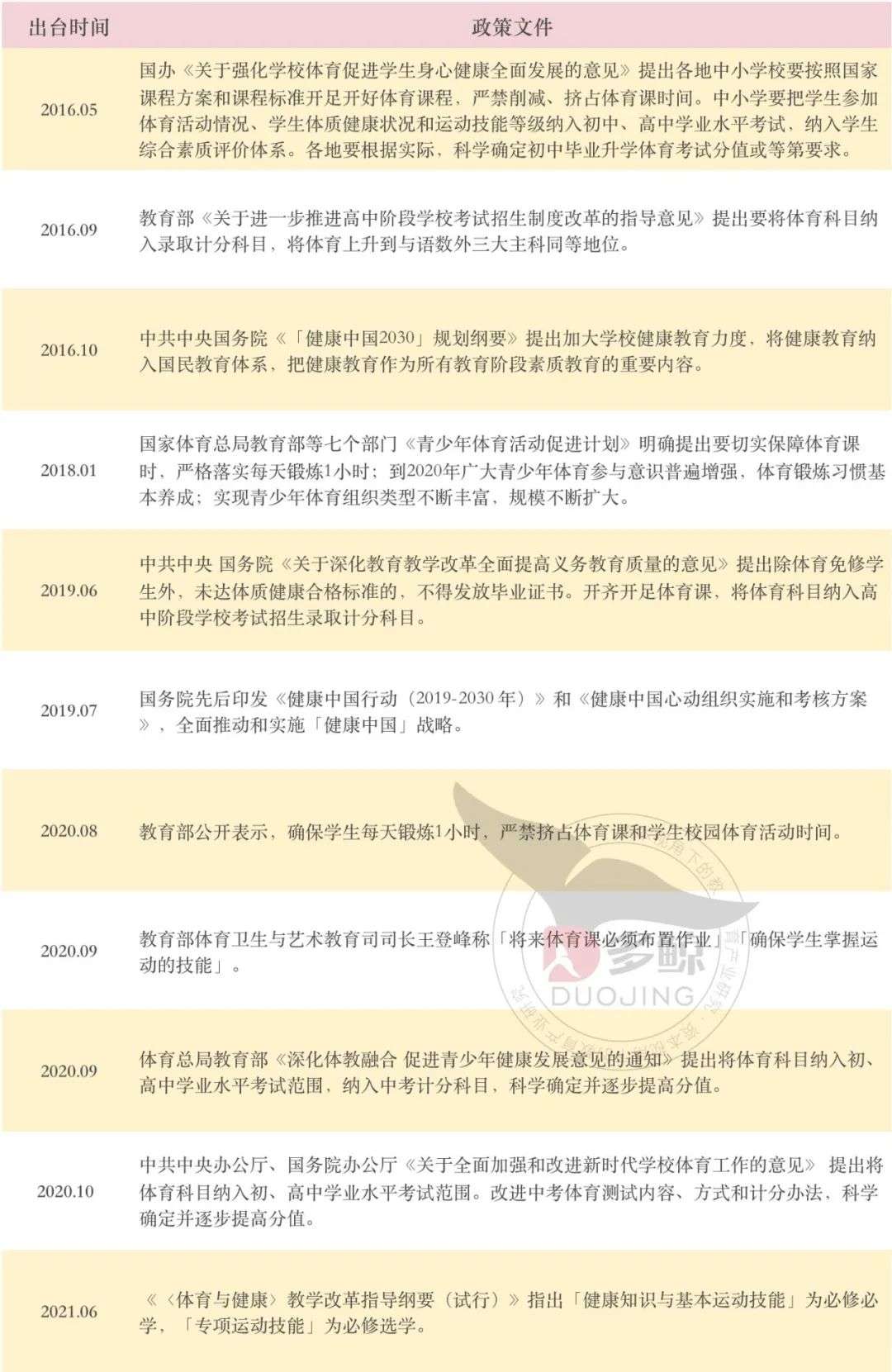 历数国家近年来相继出台的多项支持措施,在保障课时、纳入体测和升学考试等多方面展现出对体育学科的重视。其中,2020 年出台的《关于全面加强和改进新时代学校体育工作的意见》可谓集大成者,明文支持包括「鼓励基础教育阶段学校每天开设 1 节体育课」「将达到国家学生体质健康标准要求作为教育教学考核的重要内容」「将体育科目纳入初、高中学业水平考试范围」「改进中考体育测试内容、方式和计分办法,科学确定并逐步提高分值」。