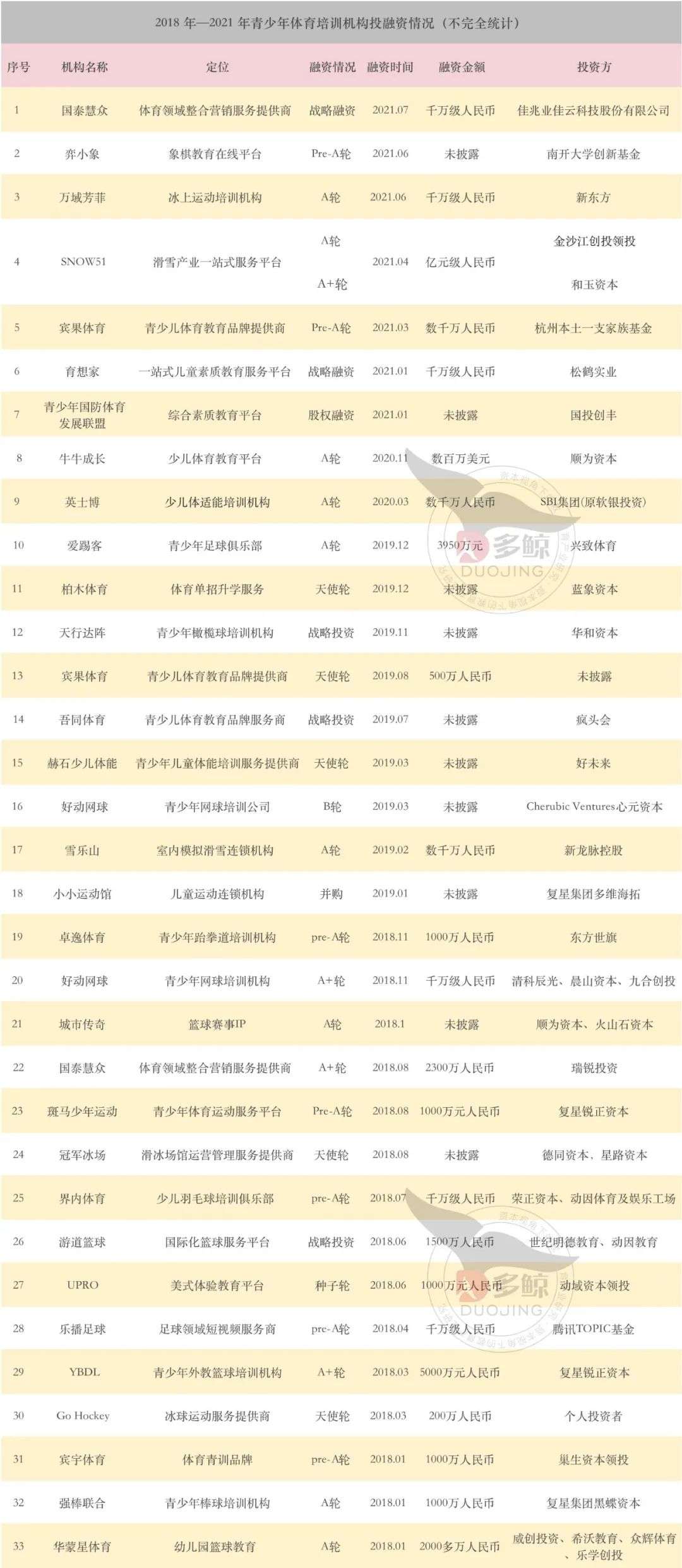 千亿市场,吸引资本不断流入。据不完全统计,近 4 年里青少年体育培训赛道投融资事件共有 33 起,融资金额超过 4亿元,轮次多为 Pre-A 轮和 A 轮,融资金额主要集中在千万级人民币体量,篮球、足球品类融资数量遥遥领先。而从每年投融资事件的数量来看,投资逐渐趋于理性,2018 年以后开始逐年递减,加上疫情影响,2020 年仅有 2 起融资。但今年以来,随着政策叠加利好,投资又有回温趋势,目前已有7家企业完成融资,其中最大一笔为 SNOW 51 的亿元级 A 系列轮融资。