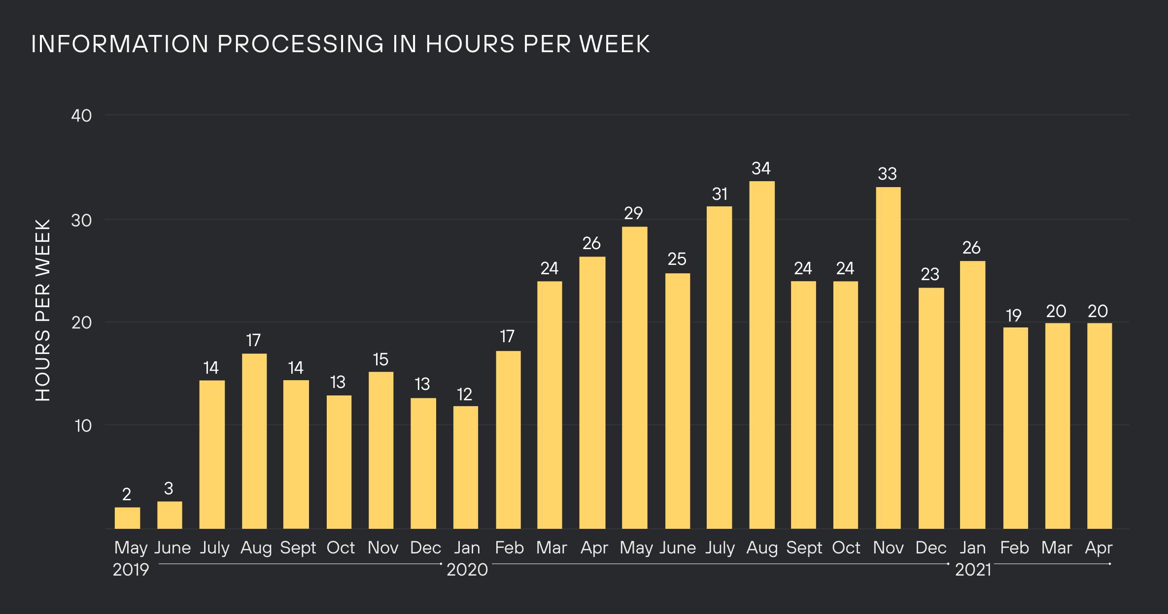 下面的图表,显示的是我在每个月内平均每周花在信息处理(主要是电子邮件)方面的小时数。例如,在2020年8月,我在信息处理方面平均每周花34小时。