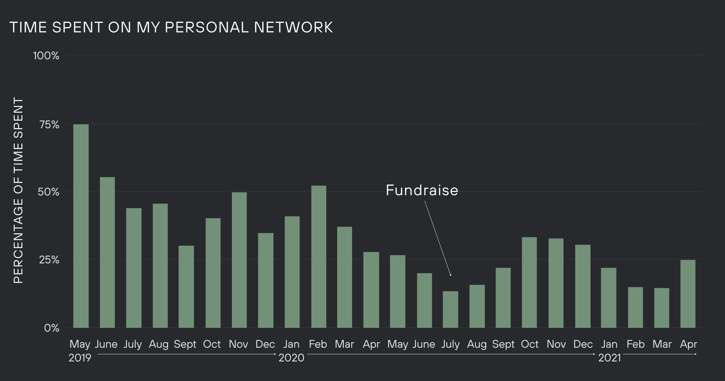 在我们的融资期间,我花在人际关系网络维护上的时间减少了,但一般情况下,我会花很多时间做这件事,不仅因为它能够为公司带来很多价值,还因为它有助于实现个人成就感。
