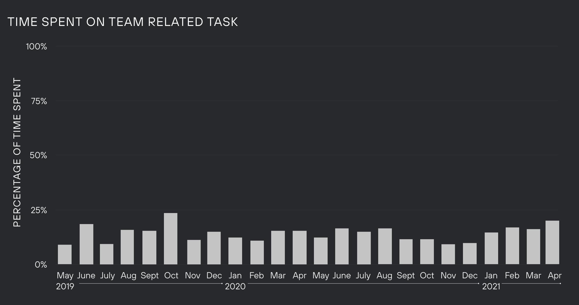 有趣的是,这些数据显示我在这方面的投入基本上保持着稳定的趋势。2019年6月,公司只有两个人:我和联合创始人乔什(Josh)。然而,两年之后,我们的团队规模已经是两年前的10倍之多,并且我有更多的直接下属,但我花在团队相关任务上的时间比例仍然是趋于一致的。