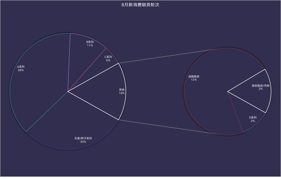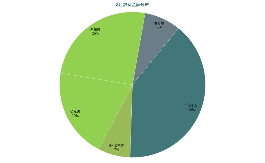 另外从融资轮次上来看,资本仍以早期项目为主,A系列及天使轮占比达到68%,但与7月的71%相比,比重有所减少;且B轮及B轮之后的融资数量明显增多,占比达到32%。如B轮7月10%、8月11%;C/D/E/F系列7月4%、8月7%。
