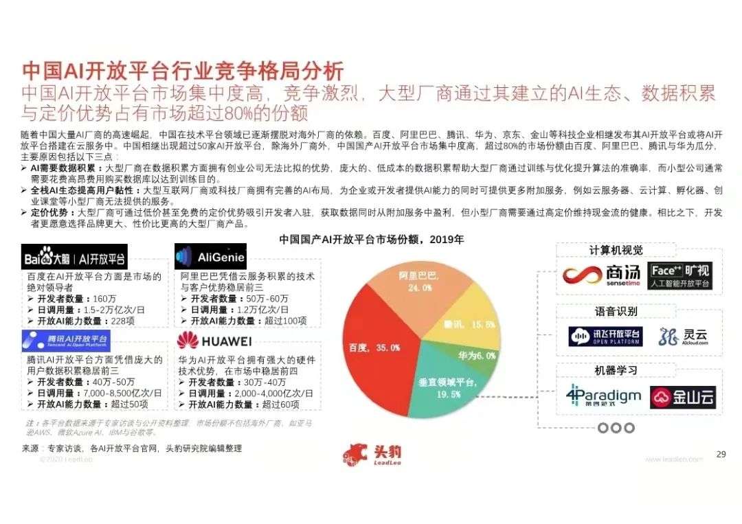 目前,国内AI开放平台已形成较为清晰的格局:百度、阿里、腾讯、华为等互联网巨头主打综合性AI开放平台,在国内占据了超过80%的市场份额;而商汤、旷视、讯飞等则在计算机视觉、语音识别等细分领域打造了AI开放平台,它们共同争夺剩下20%的市场份额。