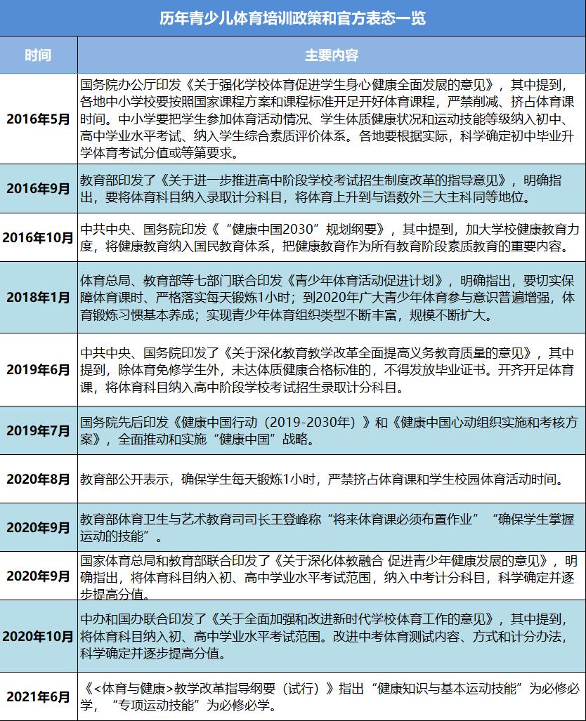 客观来看,体育培训行业之所以频频释放利好消息,与国家出台的一系列配套政策有关。