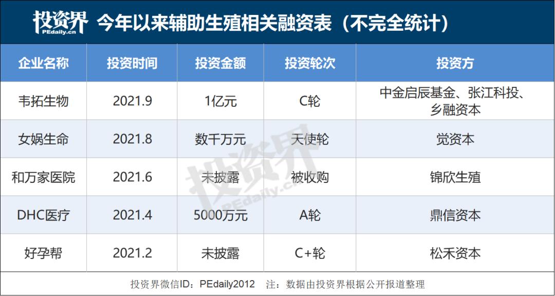 据不完全统计,今年至少有5家公司先后获得融资,分别是韦拓生物、女娲生命、和万家医院、DHC医疗、好孕帮,背后投资方既有中金启辰基金、松禾资本、鼎信资本等VC/PE机构,也有上市公司锦欣生殖。
