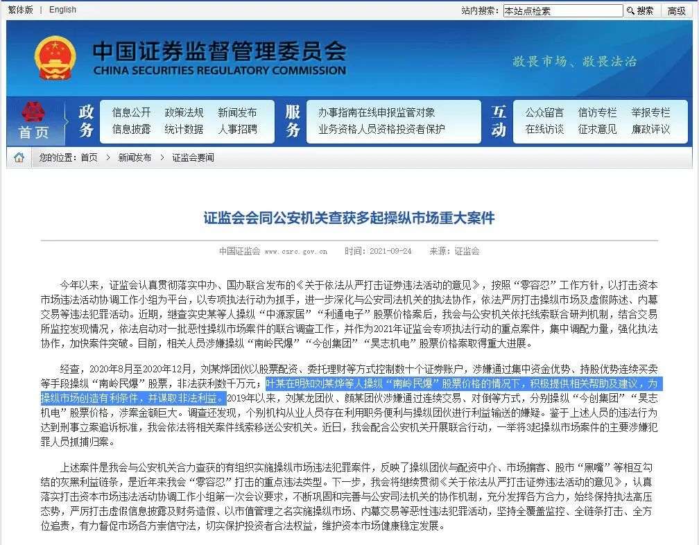 今年9月24日证监会公布,2020年8月至2020年12月,刘某烨团伙以股票配资、委托理财等方式控制数十个证券账户,涉嫌通过集中资金优势、持股优势连续买卖等手段操纵“南岭民爆”股票,非法获利数千万元;叶飞在案件中的作用是在明知刘某烨等人操纵“南岭民爆”股票价格的情况下,积极提供相关帮助及建议,为操纵市场创造有利条件,并谋取非法利益。