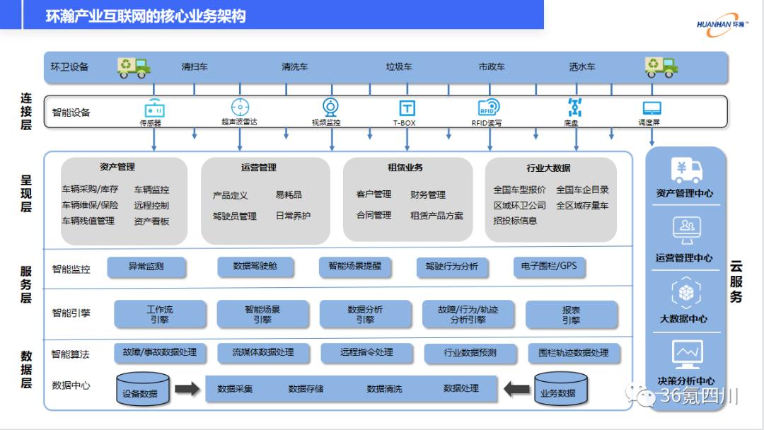 孙炜所在的环瀚科技已经跑通了商业模式,形成了资产管理、运营管理、大数据、决策分析四个中心,包括四个层面:连接层:传感器、超声波雷达、视频监控、T-BOX、RFID读写、底盘和调度盘;呈现层:资产管理(车辆采购/库存、车辆维保/保险、车辆残值管理、车辆监控、远程控制、资产看板)、运营管理(产品定义、驾驶员管理、易耗品、日常养护)、租赁服务(客户管理、合同管理、务管理、租赁产品方案)和行业大数据(全国车型报价、区域环卫公司、招投标信息、全国车企目录、全区域存量车);服务层:智能监控(异常监测、数据驾驶舱、智能场景提醒、驾驶行为分析、电子围栏/GPS);智能引擎(工作流引擎、智能场景引擎、数据分析引擎、故障/行为/轨迹分析引擎、报表引擎);数据层:智能算法(故障/事故数据处理、流媒体数据处理、远程指令处理、行业数据预测、围栏轨迹数据处理)、数据中心(设备数据/业务数据:采集、存储、清洗、处理)。