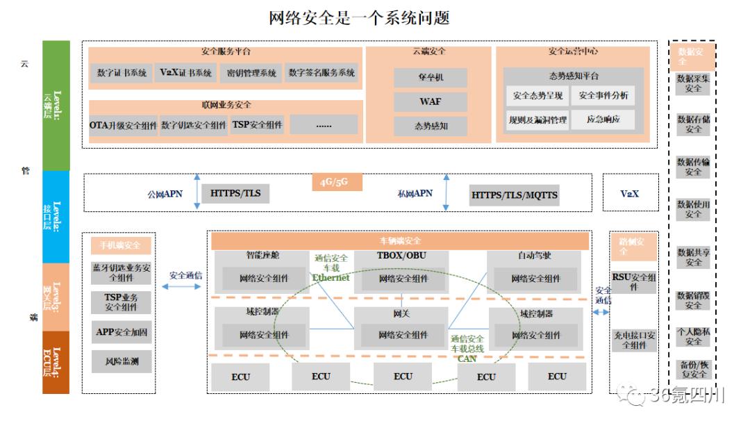 智能网联汽车网络安全专家、为辰信安CEO李允表示,智能网联汽车安全是一个包括云(安全服务平台、云端安全、安全运营中心)、管(4G、5G、V2X等)、端(手机、车辆、路)的系统问题。在数据安全方面,包括数据采集、存储、传输、使用、共享、销毁、隐私、备份/恢复,等环节的安全。